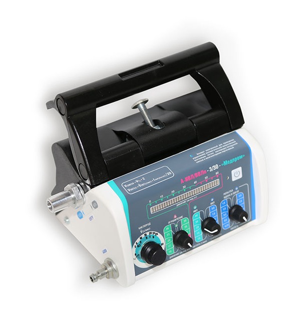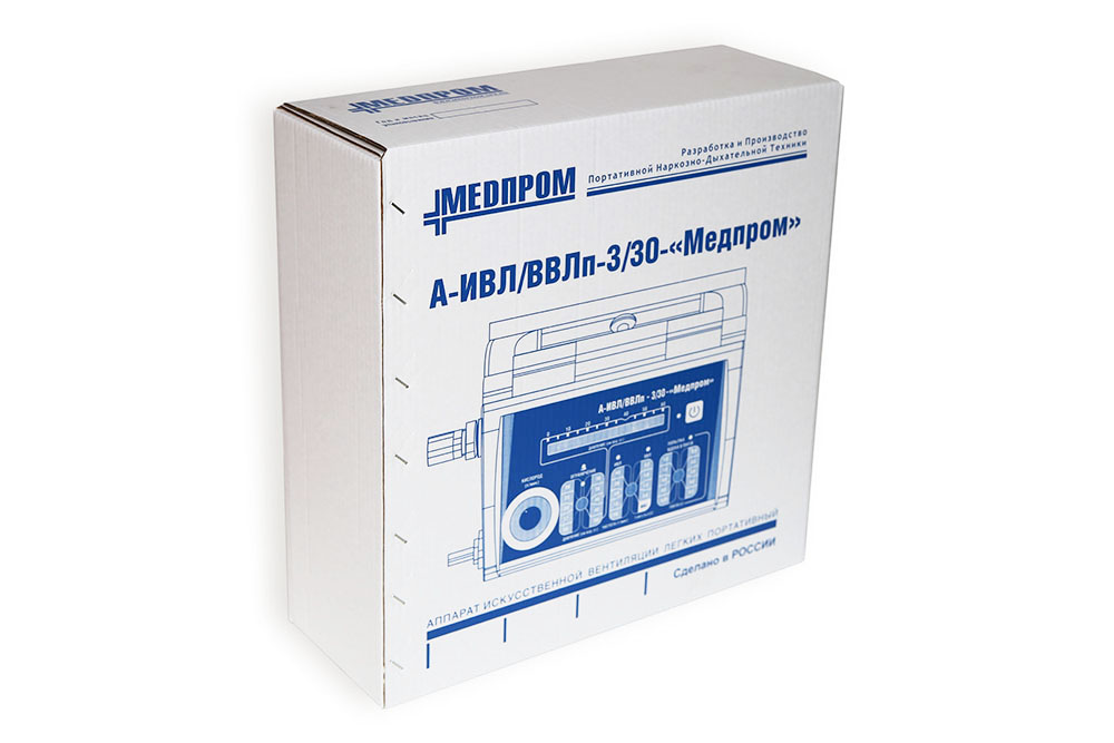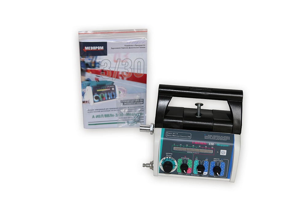 Аппарат А-ИВЛ/ВВЛп-3/30 – «Медпром» электронный предназначен для проведения управляемых по объёму с ограничением по давлению следующих режимов вентиляции лёгких кислородом и кислородно-воздушной смесью: управляемой искусственной вентиляции легких (ИВЛ), вспомогательной искусственной вентиляции легких (ВВЛ), а также оксигенотерапии (ингаляции) кислородно-воздушной смесью с возможностью установки паузы на выдох и контролем попытки вдоха в паузе в условиях выездной службы интенсивной терапии и реанимации, на дому, в медицинском транспорте, при спасательных мероприятиях, а также в палатах интенсивной терапии в медицинских лечебных учреждениях.