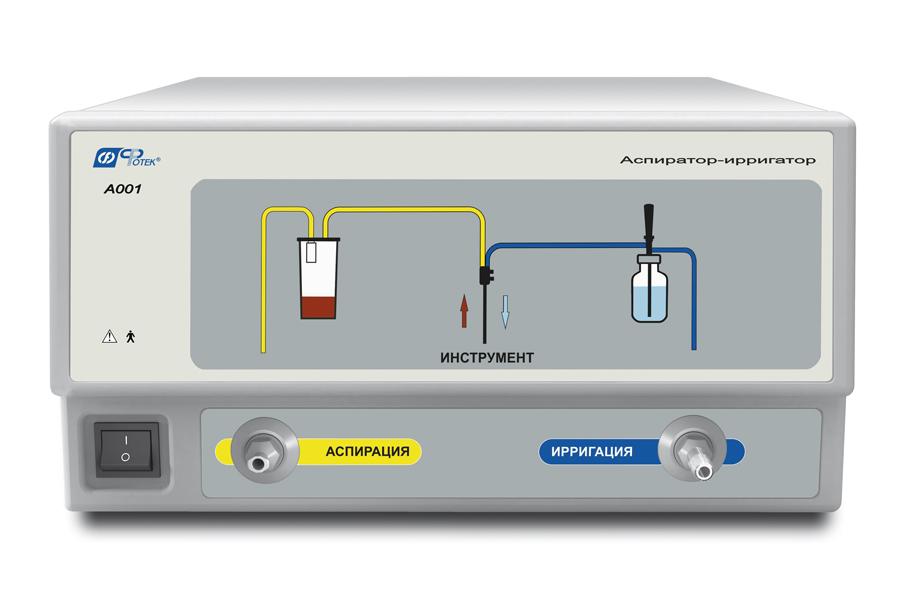 Аппарат А001 АИХ6-01-"ФОТЕК" предназначен для промывания физиологическим раствором внутренних полостей пациента при различных лапароскопических вмешательствах. Может использоваться для аспирации жидкости совместно с кавитационным ультразвуковым аппаратом АК102.
