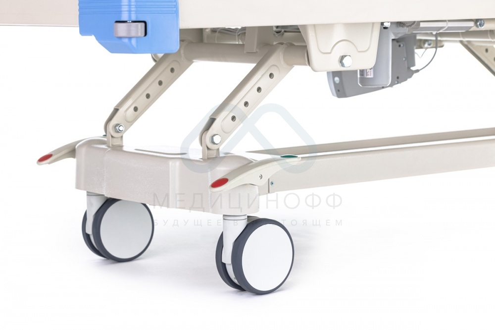 - Кровать медицинская с электроприводом имеет 150-миллиметровые колёса с центральной тормозной системой. Колеса изготовлены из антистатичного полимера, который не царапает пол.