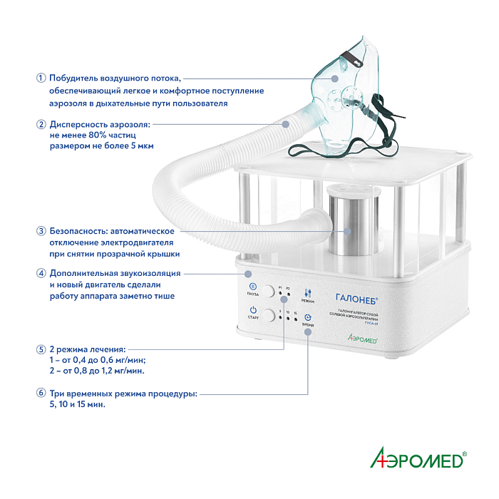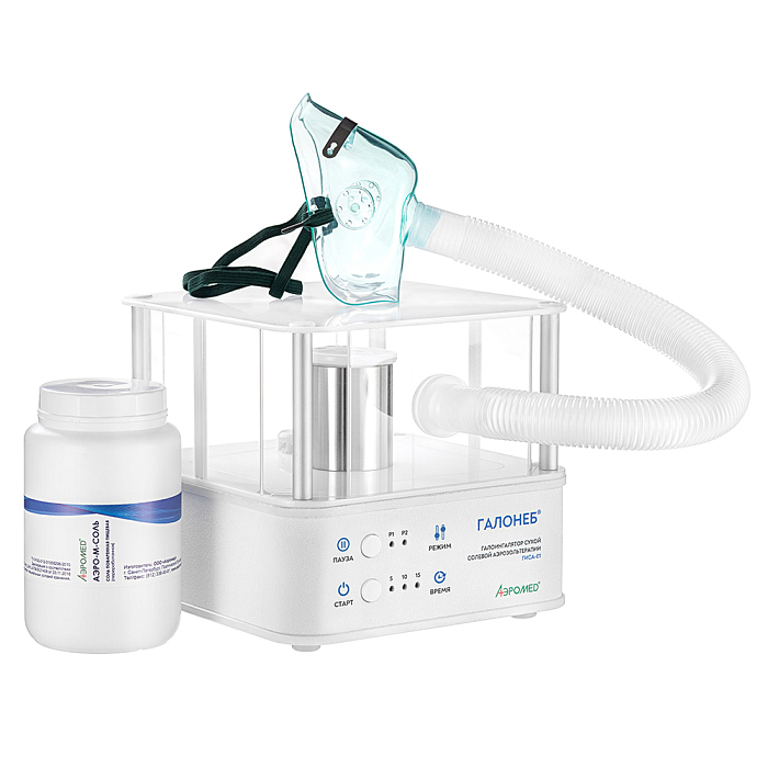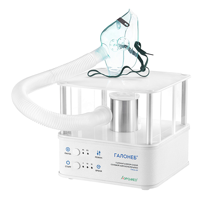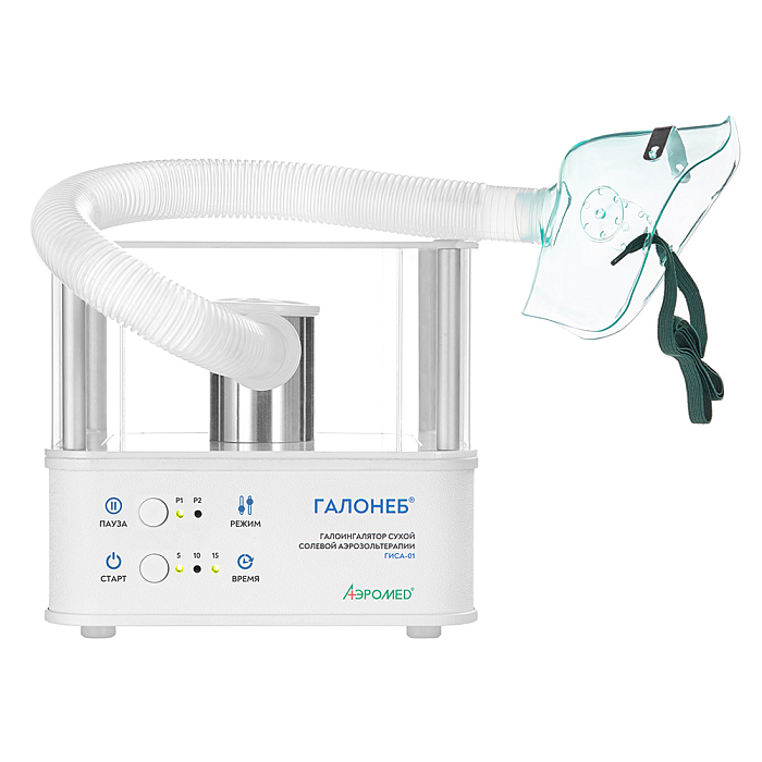 Галоингалятор ГИСА-01 (Галонеб™) предназначен для проведения галоингаляционной терапии органов дыхания с помощью сухого высокодисперсного аэрозоля хлорида натрия, моделирующего лечебный микроклимат соляной пещеры. По мере вдыхания соляного аэрозоля, который формируется внутри аппарата, мельчайшие частицы соли, обладающие отрицательным зарядом, оседают на стенках органов дыхания. Благодаря уникальным физико-химическим свойствам сухого солевого аэрозоля, в организме пациента запускаются естественные процессы очищения, восстановления и защиты органов дыхания, за счёт следующих действий аэрозоля: