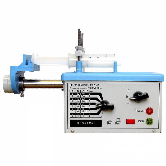 Предназначен для введения (инфузий) физиологических растворов, лекарственных препаратов и биологически активных веществ в организм человека. Применяется для эпидурального, подкожного, артериального и энтерального вливания при помощи специально установленной автоматической программы, рассчитывающей объем введения препаратов. Шприцевой дозатор (инфузионный) получил широкое применение в различных отраслях современной медицины.
