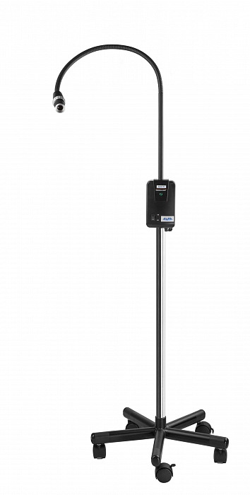 - Штатив выполнен из хромированной стали и закреплен на звездообразном основании диаметром 47см с пятью самоориентирующимися колесами, два из которых имеют стопоры для предотвращения самопроизвольного передвижения светильника.
