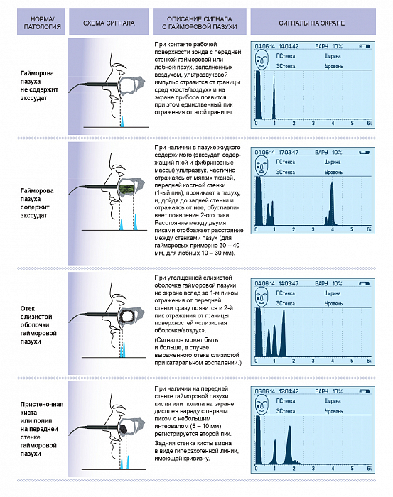 - А+А эхограмма слева и справа (для выявления наличия в пазухах жидкости и новообразований) - М-эхо ( для определения уровня жидкости в пазухе) |