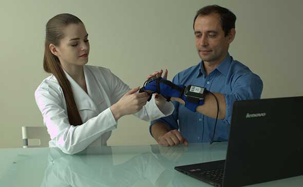 - Первый этап — диагностика. Изучается объем пассивных и активных движений пальцев, запястья и предплечья. Итоговые результаты исследования сохраняются. Программа анализирует эту информацию и выявляет возможности пациента.