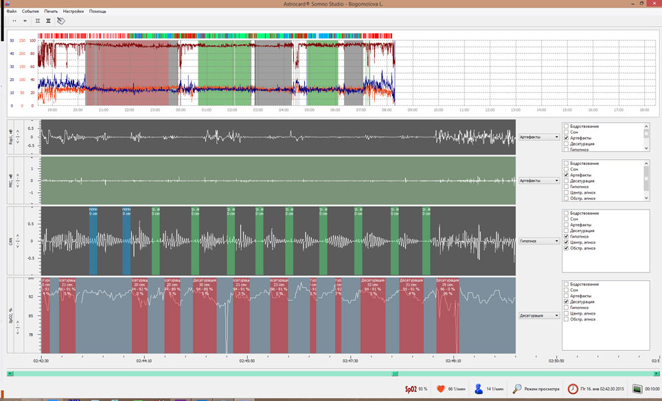 Программное и аппаратное обеспечение комплекса для проведения полисомнографических исследований автоматизированный «Астрокард® - Сомностудия» обеспечивает высокую точность измерений, современный уровень автоматизации и детализации исследования с возможностью автоматического распознавания эпизодов апноэ, а также обладает высокоинформативным удобным интерфейсом.