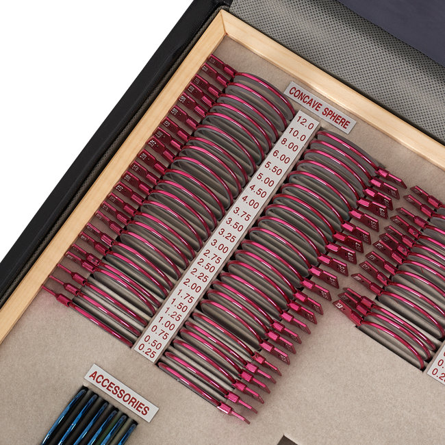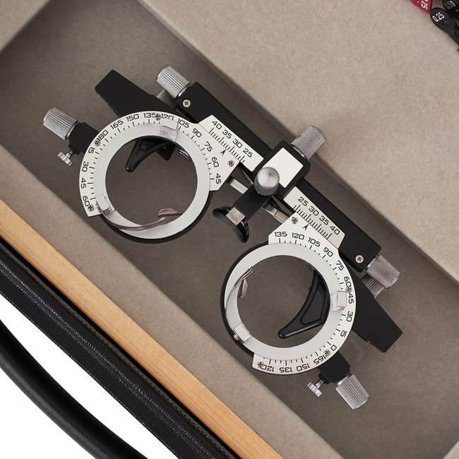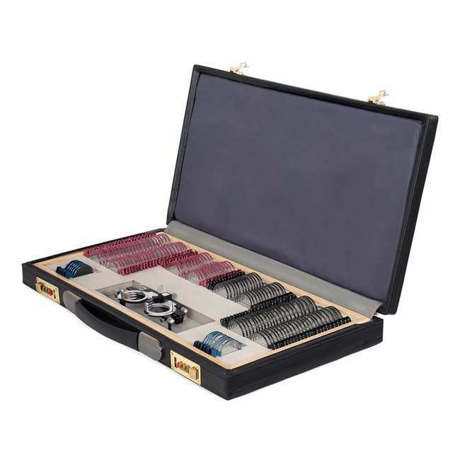 Набор пробных очковых линз укомплектован пробной универсальной оправой ОПУ и поставляется в кожаном чемодане.