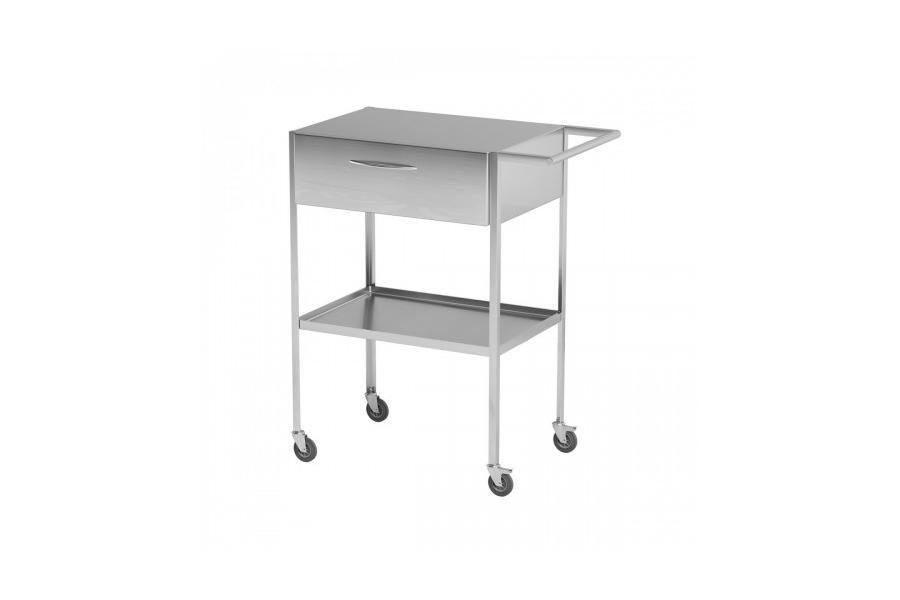 Столик манипуляционный2 выдвижных ящика и 2 съемные полки изготовлены из нержавеющей стали. Каркас выполнен из металлической профильной трубы 20х1,5 мм. Столик установлен на самоориентирующиеся колесные опоры, две из которых с тормозом.