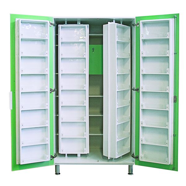 Вместительный шкаф для хранения медикаментов и расходных материалов с 48 ячейками и внутренними двухсторонними поворотными створками.Внешние дверцы открываются на 180°, запираются на центральный замок.