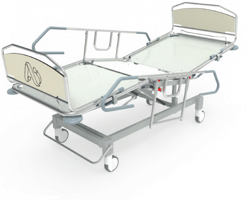 - Рама кровати установлена на ножки, выполненные из стальных труб круглого и прямоугольного сечения. Ножки установлены на колеса 125мм с центральным тормозом.