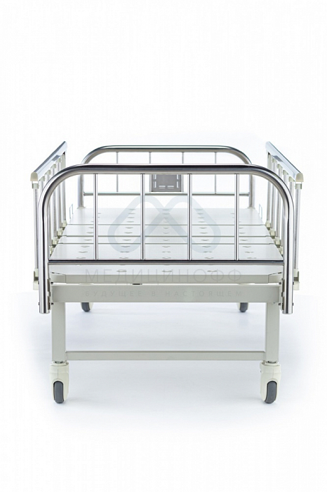 Медицинская механическая функциональная кровать В-13 оснащена съемными торцевыми спинками из нержавеющей стали. Спинная и ножная секция регулируемые. Колеса выполнены из антистатического материала, благодаря чему напольное покрытие не царапается и не повреждается. Колеса самоориентирующиеся, имеют диаметр 125 мм. Оснащены индивидуальным тормозом для частичной фиксации. Кровать оснащена 4 отверстиями для установки дополнительного оборудования.Секционная модель имеет механизмы червячного типа, которые оборудованы защитными и пластиковыми накладками для предотвращения попадания влаги и пыли. Ручки подъемников складываются и убираются, чтобы медперсонал не спотыкался. Все подъемные механизмы оснащены звуковым сигналом в минимальном и максимальном положениях. Торцевая спинка оборудована специальной табличкой для данных пациента.