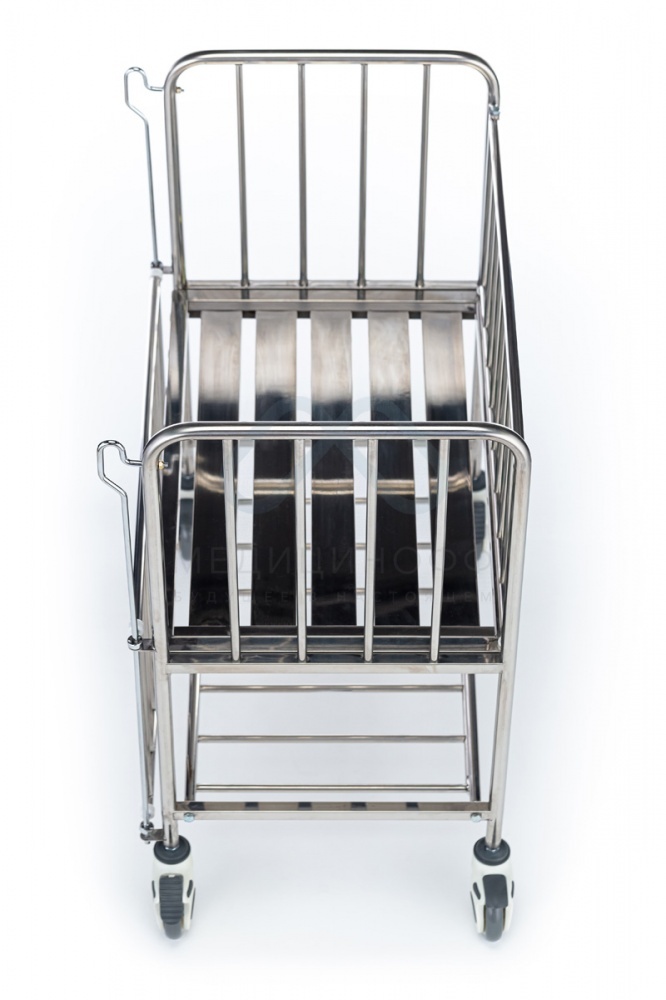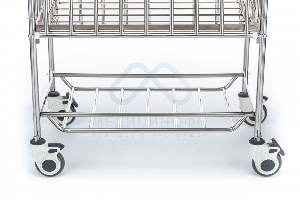 - Медицинская кровать для ребенка оснащена колёсами диаметра 100 мм, обеспечивающими беспроблемную транспортировку пациента. Каждое колесо снабжено индивидуальным тормозным механизмом.