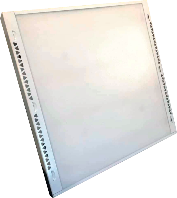 - В верхней части расположен модуль рециркулятора. Воздух из помещения поступает за счет вентиляторов в корпус светильника и обеззараживается благодаря бактерицидной ультрафиолетовой лампе, после этого поступает обратно в помещение.