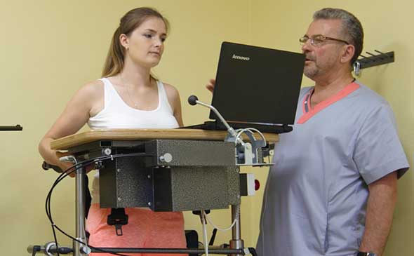 - Пациент помещается в тренажер, фиксируются стопы, колени, таз. Стабилизируется туловище. Сеанс реабилитации проводится в виде компьютерной игры. Пациент управляет её действием отклоняя туловище в разных направлениях. Посредством специальных датчиков, установленных на тренажере, программа считывает траектории движений пациента и отображает их на мониторе.