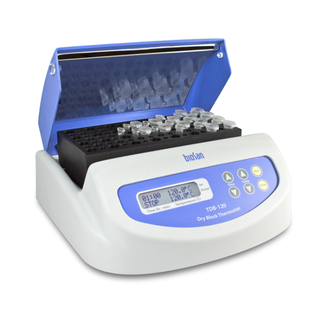 - Термостат TDB-120 предназначен для поддержания постоянной температуры образцов в пробирках, помещенных в гнезда алюминиевого блока.