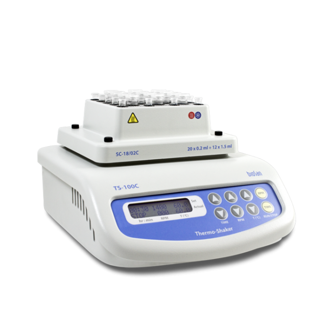- Термошейкер TS-100C обеспечивает перемешивание и терморегулирование образцов в микротест пробирках, ПЦР-планшете.