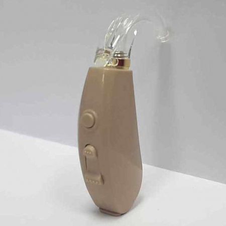 Заушный слуховой аппарат - крепится на раковине по принципу очков, при надевании не требуется посторонняя помощь, органы управления крупные, что важно при ухудшении мелкой моторики.