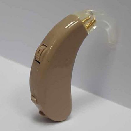 Заушный слуховой аппарат - крепится на раковине по принципу очков, при надевании не требуется посторонняя помощь, органы управления крупные, что важно при ухудшении мелкой моторики.