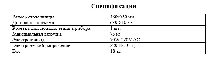 Колесики имеют систему блокировки. Розетка для подключения прибора Моторизированный подъем столешницы. Низкий уровень шума.