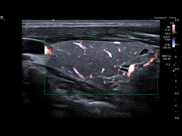 Уровень сосудистой визуализации SMI в сочетании с высокой частотой кадров повышает диагностическую достоверность при оценке поражений, кист и опухолей.
