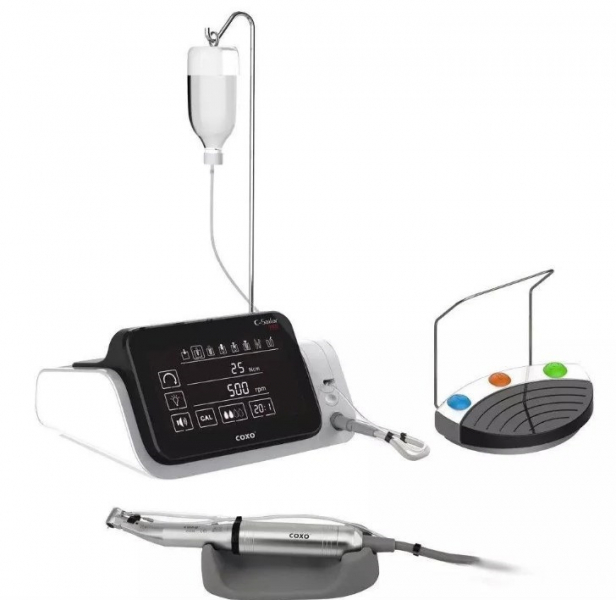 - Аппарат оснащен легким бесщеточным микромотором и хирургическим наконечником (20:1) с фиброоптикой.