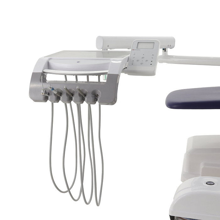 Блок ассистента на поворотной изогнутой штанге с эжекторным слюноотсосом, пылесосом, пистолетом вода/воздух и портом для установки дополнительного инструмента.