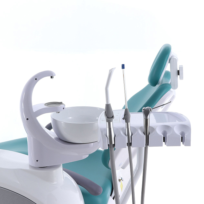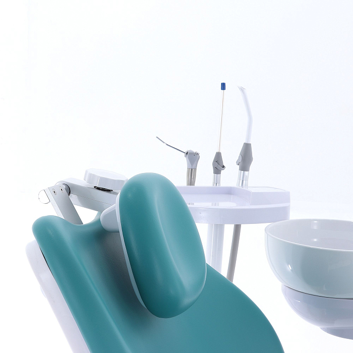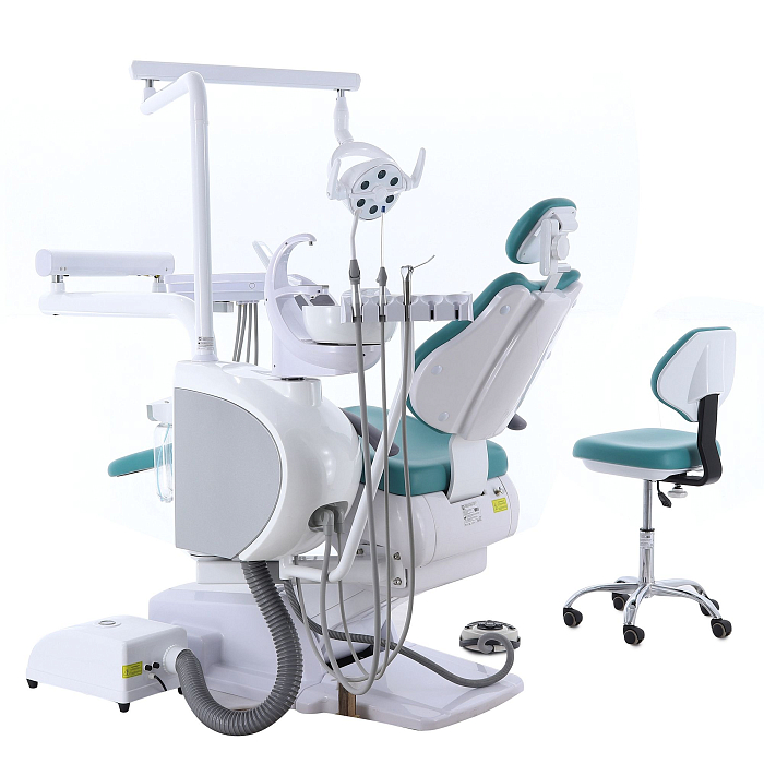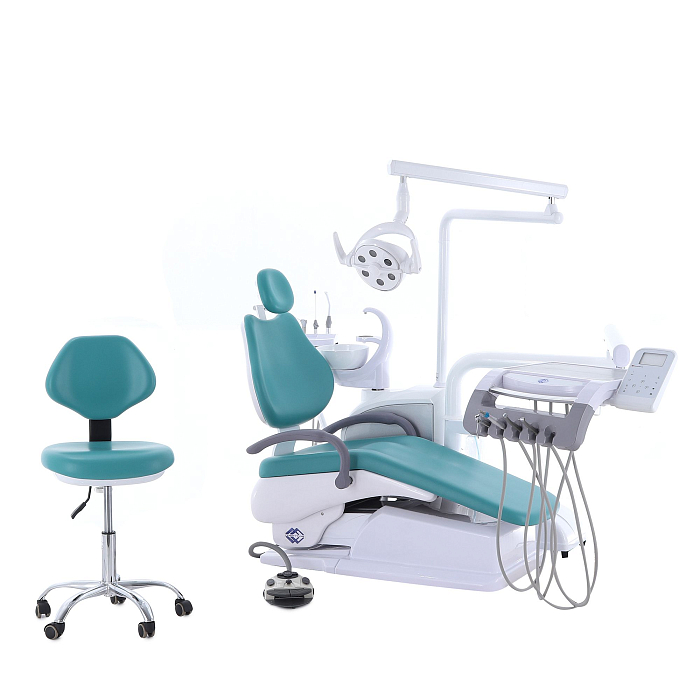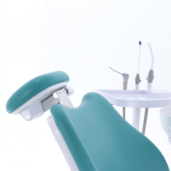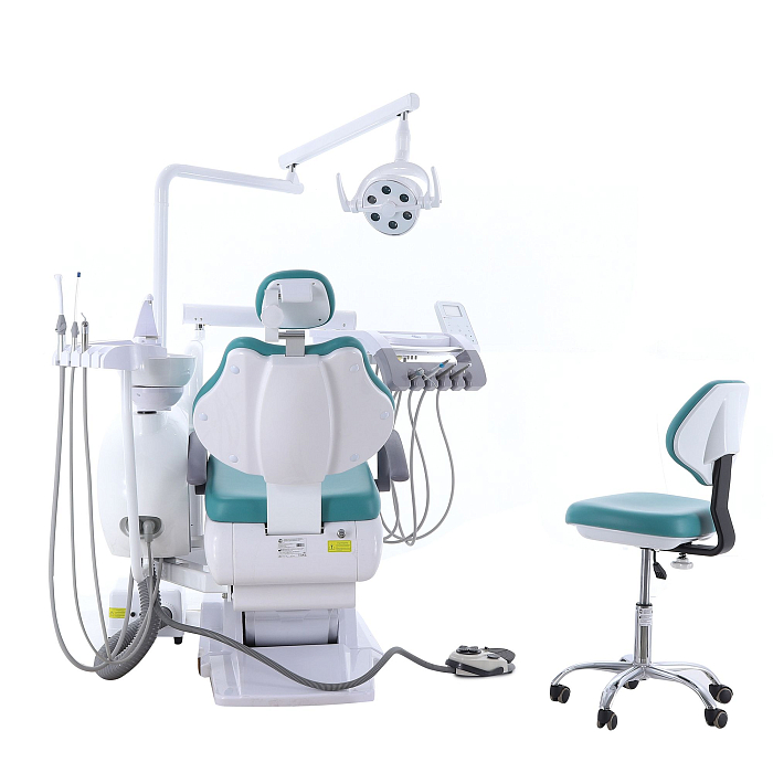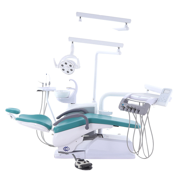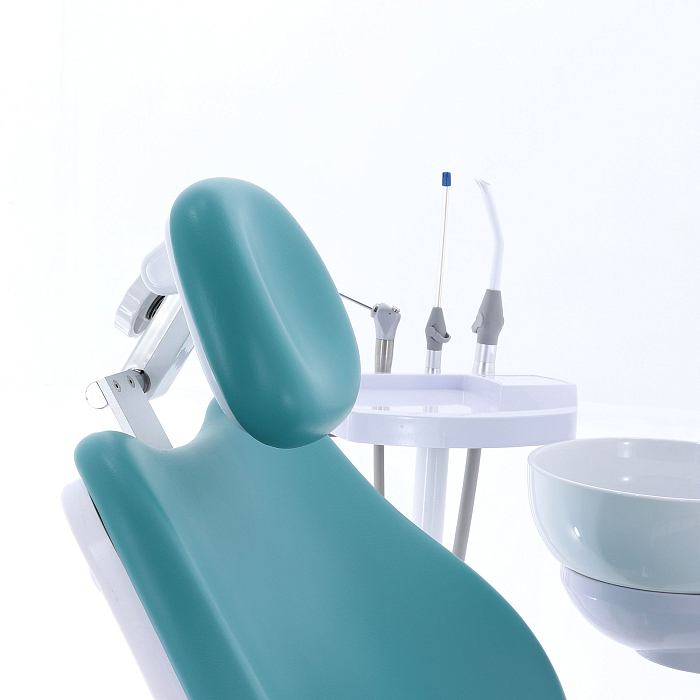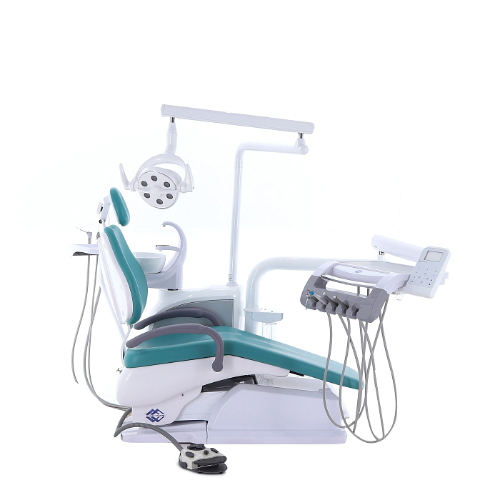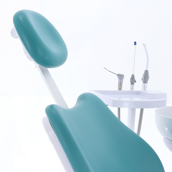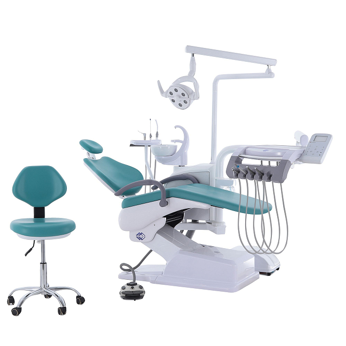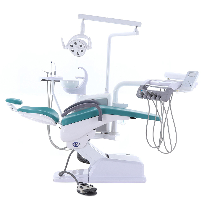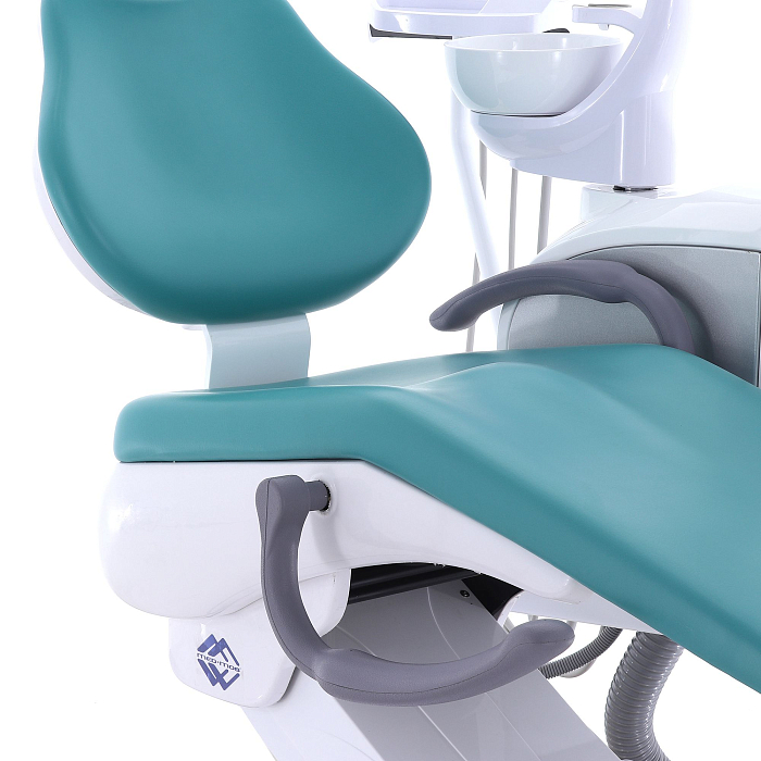 Кресло пациента: каркас и станины выполнены из стали с высококачественным полимерно-порошковым покрытием, с накладками из ПВХ-пластика, обивка из бесшовной ПУ-кожи с эластичным ППУ наполнителем, устойчивы к дезинфекционной обработке, с регулируемым по высоте и углу наклона подголовником и стационарным (левый) и откидным (правый) подлокотниками; управляется с помощью клавиатуры модуля врача, джойстиком на многофункциональной педали, на блоке ассистента;