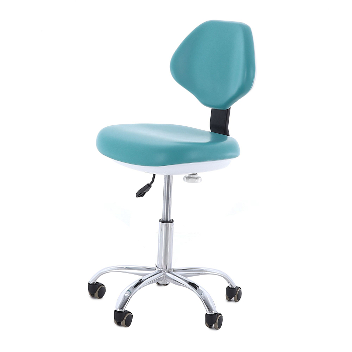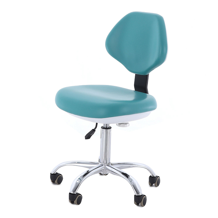 Стул врача: на колесах (Ø49*45 мм), с нерегулируемой спинкой, сиденье (45*38,5 см) с обивкой из бесшовной ПУ-кожи с эластичным ППУ наполнителем, устойчив к дезинфекционной обработке; регулировка высоты: 49-63 см
