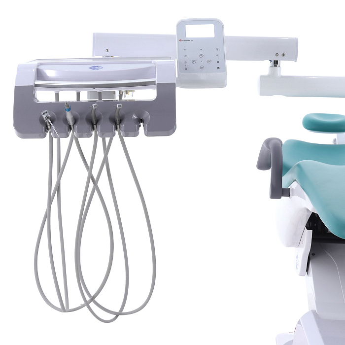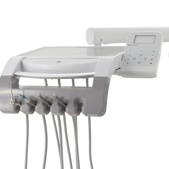 Инструментальный блок: нижняя подача; пантографическое плечо с пневматической блокировкой положения, из ABS-пластика, стали и алюминиевого сплава с высококачественным полимерно-порошковым покрытием, поворотный (170*), с интегрированным столиком врача (29*42,9*0,5 см, регулировка высоты от пола: 72-136 см), с силиконовой накладкой на столик (29*42*0,1 см) с возможностью автоклавирования