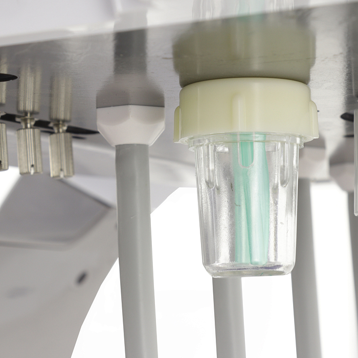 Гидроблок: эжекторный, поворотный (80*), с креплением к креслу, с керамической чашей-плевательницей, бойлером для подогрева, бутылкой для дистиллированной воды и бутылкой для дезинфекционной жидкости, напольным выносным блоком коммутации (39*26*19 см)