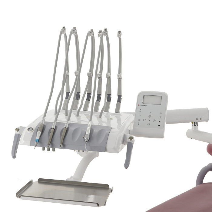 Блок ассистента на поворотной изогнутой штанге с эжекторным слюноотсосом, пылесосом, пистолетом вода/воздух и портом для установки дополнительного инструмента.