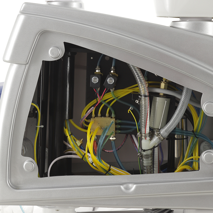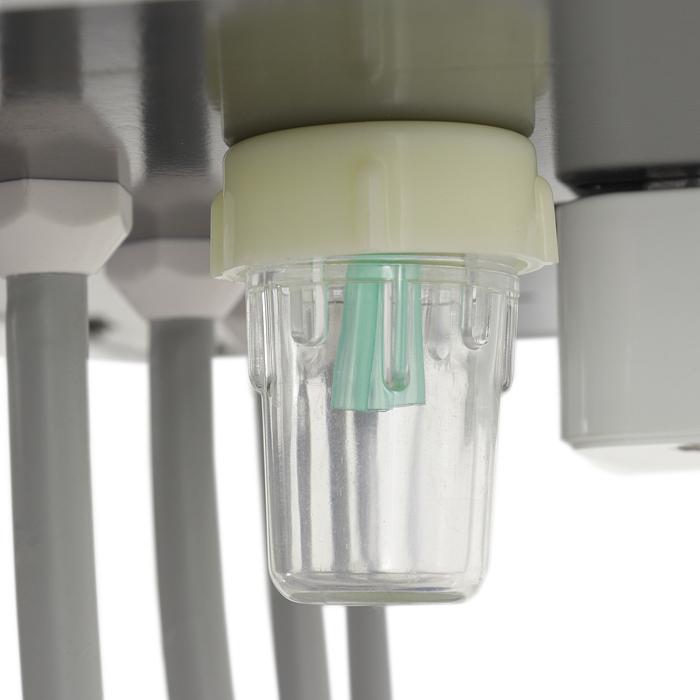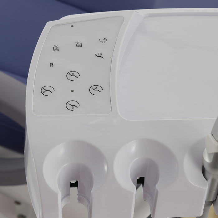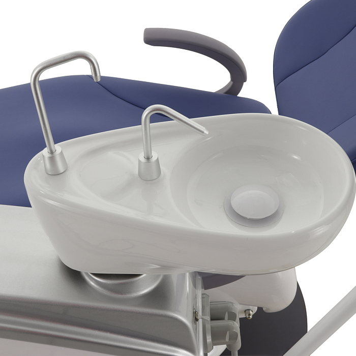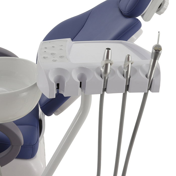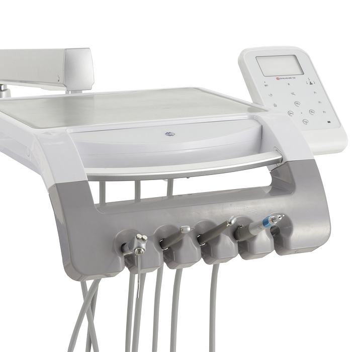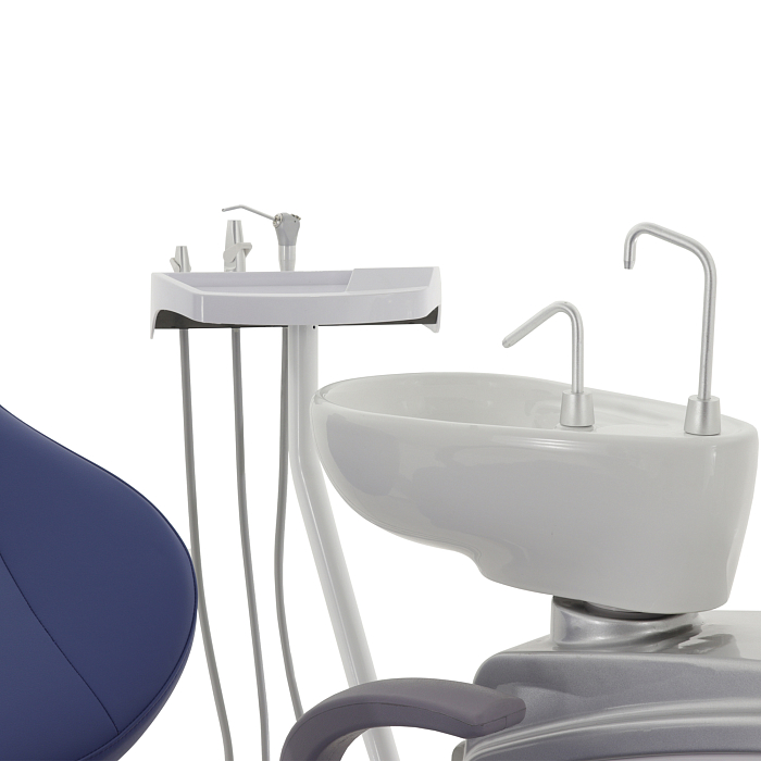 Поворотный гидроблок оснащен поворотной керамической чашей плевательницы, бутылкой для подачи дистиллированной воды, выносной блок коммуникаций.