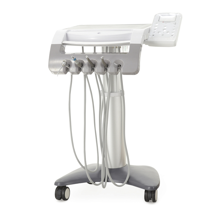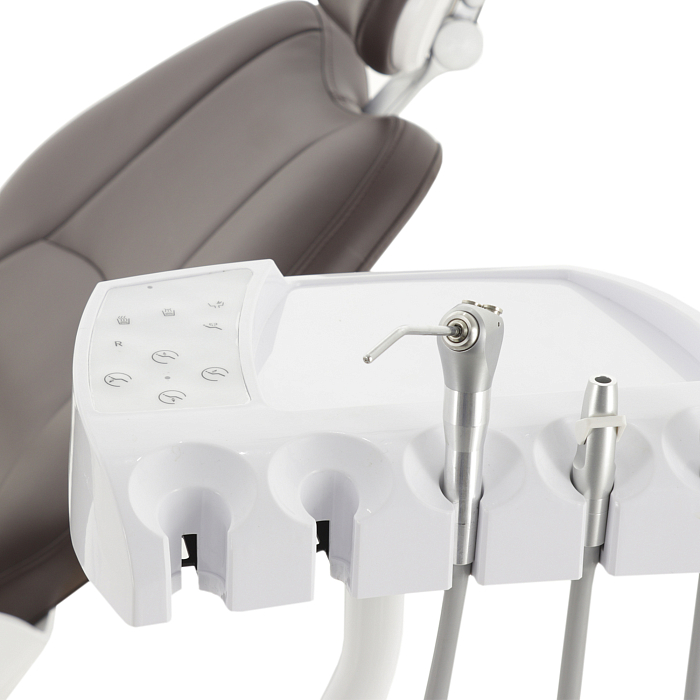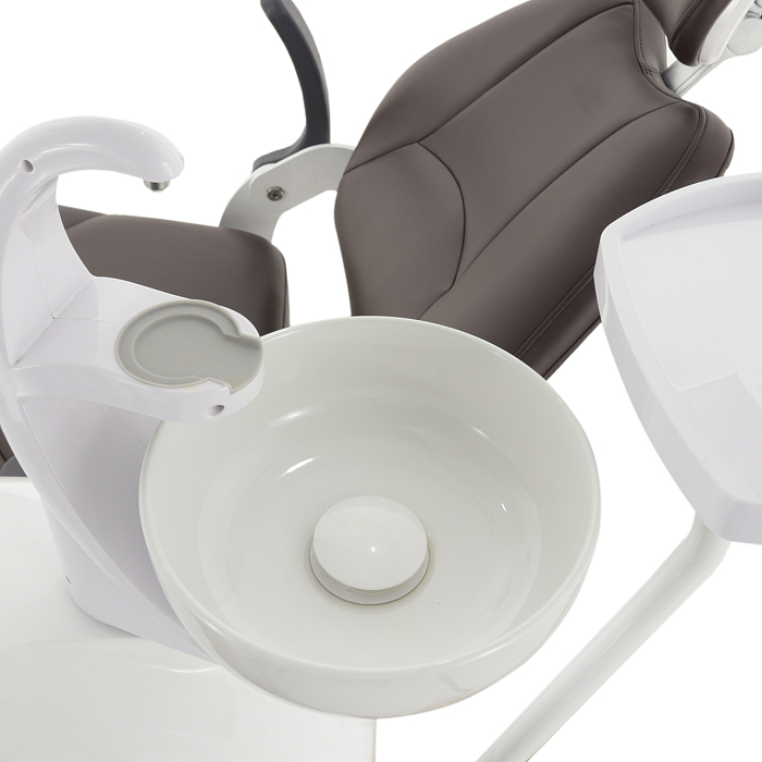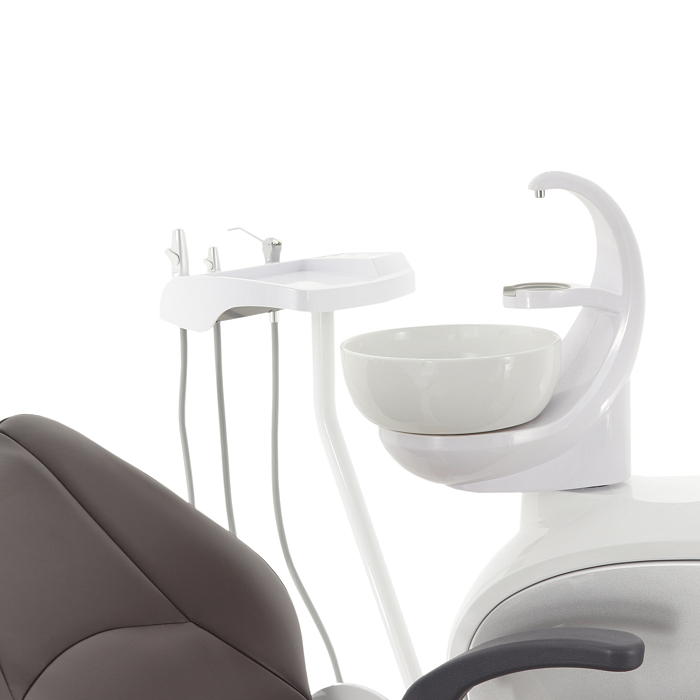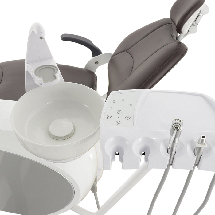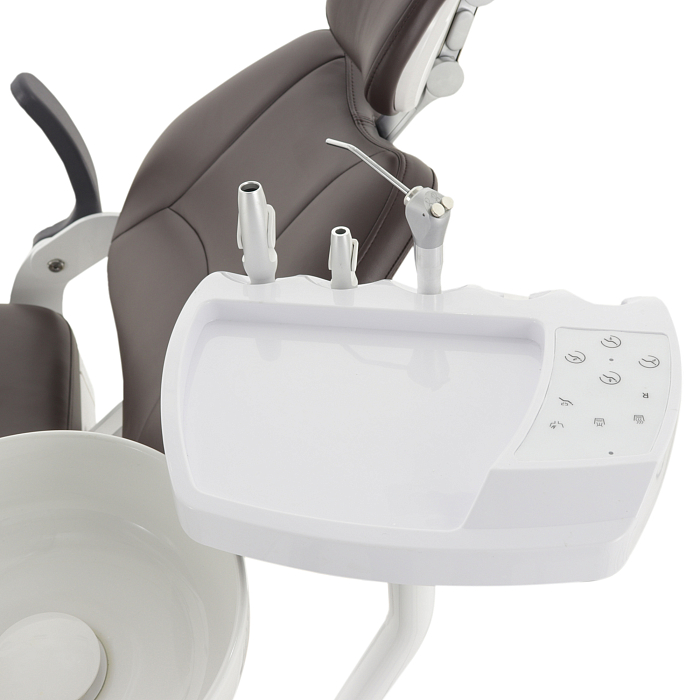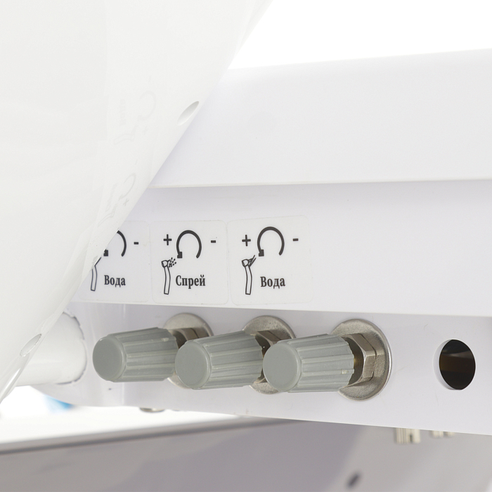 Поворотный гидроблок оснащен поворотной керамической чашей плевательницы, бутылкой для подачи дистиллированной воды, выносной блок коммуникаций.