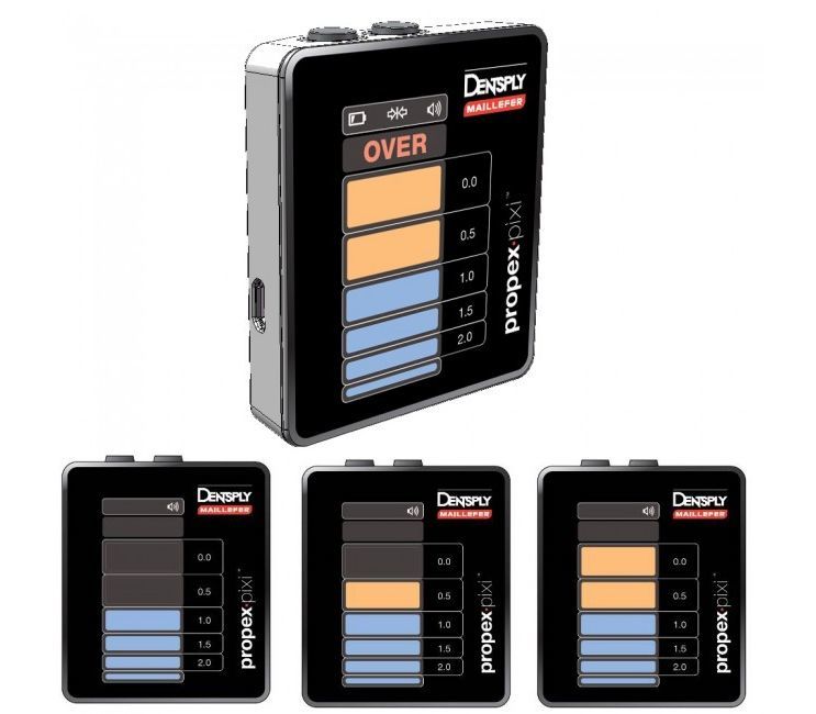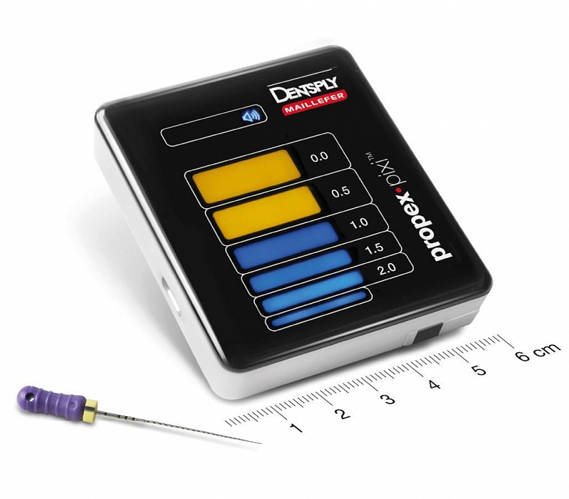 - Портативный апекслокатор "Propex Pixi" нового поколения со встроенной многочастотной технологией и функцией апикального увеличения, которая включается при достижении файлом апикальной области, помогая стоматологу локализовать апекс в большинстве корневых каналов.