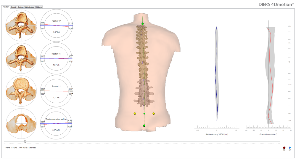 - Система DIERS 4D Motion® является ведущей технологией в области 3D реконструкции модели позвоночника и топографии поверхности спины. Впервые можно визуализировать сложную картину движения позвоночника и таза при ходьбе и анализировать полученные результаты в каждый момент времени. Этот технологический прорыв основан на инновационном программном обеспечении и улучшенной камере.