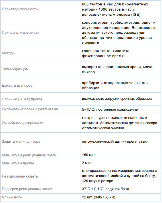 Анализатор представляет собой решение для лабораторий со средней производительностью 1800–2200 биохимических тестов в день (100–150 пациентов по 10–15 параметрам). Два охлаждаемых ротора на 90 позиций для реагентов. Ротор для образцов, контролей и калибраторов на 115 позиций. Реакционный ротор на 120 многоразовых пластиковых кювет. Анализатор опционально комплектуется ионоселективным блоком (ISE) с производительностью до 400 потенциометрических тестов в час. Управляется с помощью внешнего компьютера со специальным ПО на русском языке.