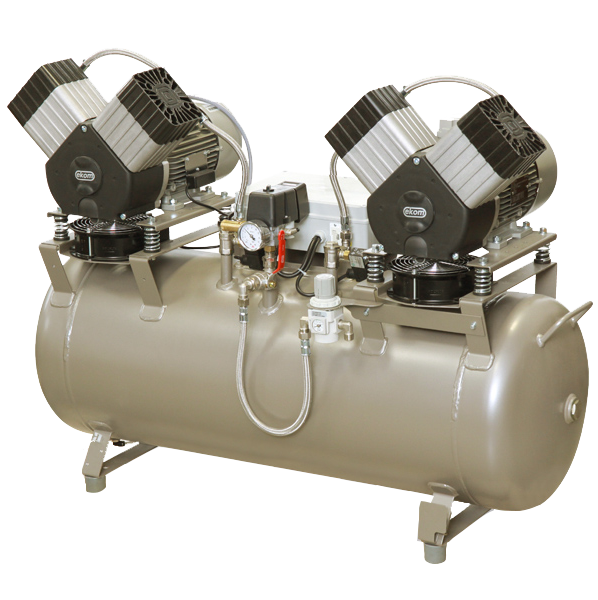 Безмаслянный компрессор EKOM серии DK50 2x2V/ 110 является источником чистого, безмасляного сжатого воздуха, предназначенного для приведения в движение зубоврачебных приборов и устройств. Благодаря своим параметрам и размерам резервуара воздуха объемом 110 л, компрессор этого типа является очень удобным для применения к обслуживанию оборудования зубопротезных лабораторий. Сжатый воздух, производимый безмасляным компрессором указанного типа, обеспечивает высокую степень соблюдения гигиены и качества труда стоматолога, не создавая, притом, вокруг себя среду, содержащую чужеродные вещества. Шкафчик S110 служит для понижения уровня шума компрессора. Шкафчик с компрессором можно расположить непосредственно в стоматологическом кабинете или лаборатории в качестве составной части дентальной мебели.