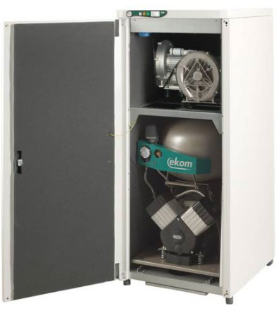 Безмаслянный компрессор EKOM с двумя отсасывающими агрегатми серии DUO 2 являются источниками чистого сжатого воздуха, несодержащего масляных капельных включений, который предназначен для приведения в действие зубоврачебных приборов и устройств, а также для создания пониженного давления в отсасывающем агрегате