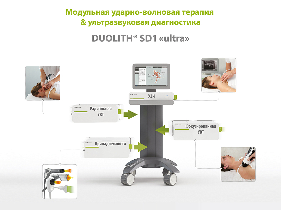 В новом DUOLITH® SD1 Ultra прогрессивные идеи объединяются с самыми продвинутыми технологиями и современным дизайном. Аппарат состоит из отдельных специализированных модулей и является завершённой терапевтической системой, которая позволяет провести УЗИ диагностику заболевания и оказать лечение на всех доступных на современном уровне глубинах. Поскольку аппарат генерирует и радиальную и сфокусированную волну, у врача есть выбор оптимального инструмента для лечения обнаруженной патологии и получения наилучшего результата.- Встроенная УЗИ диагностика (линейный датчик 40 мм).