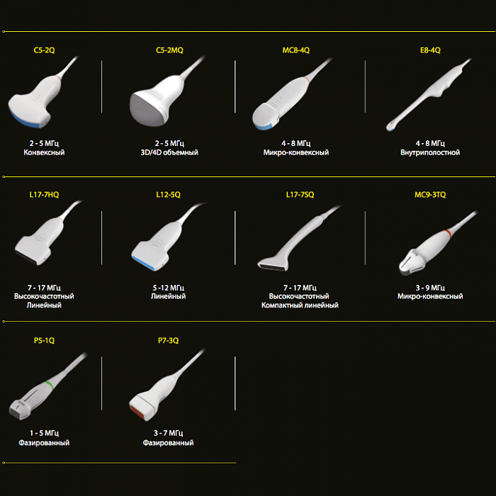 6 датчиков: один конвексный, три линейных (до 192 элемента), один фазированный (64 элемента) и один внутриполостной