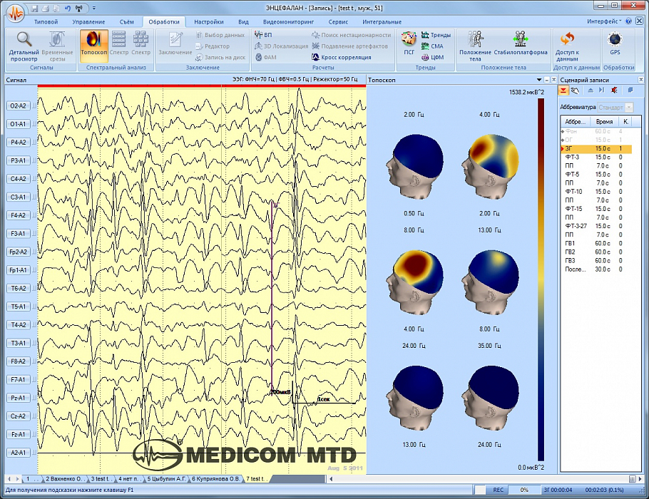 - Все виды математической обработки – спектральный, автокорреляционный и кросскорреляционный анализ, функция когерентности с топографическим картированием, математическая статистика.