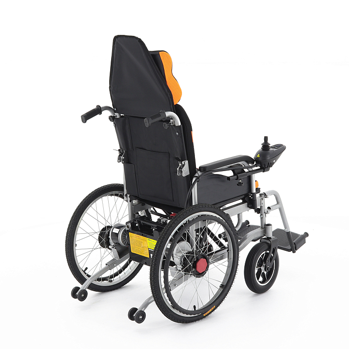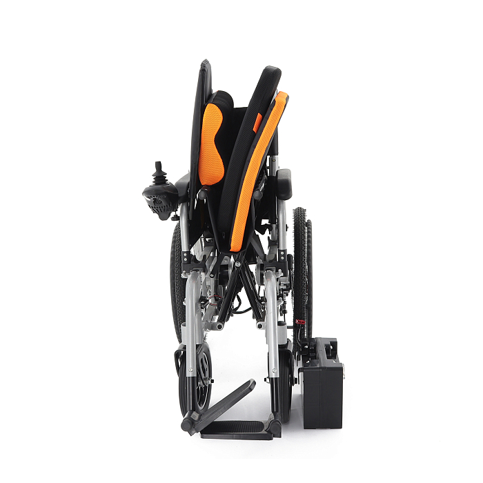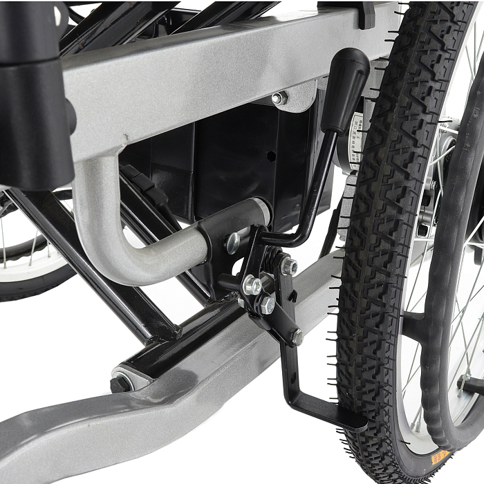 Кресло-коляска с электроприводом для людей с ограниченными возможностями передвижения, прогулочная.- Рама: складная (по ширине), ножничного типа, стальная с полимерно-порошковым покрытием, с быстросъемными. антиопрокидывателями и складными (вниз) ручками для передвижения кресла-коляски вручную сопр. лицом.