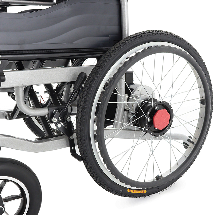 - Задние колеса: 54 см, резиновые, пневматические, с симметричным рельефным рисунком, с фиксаторами блокировки, с ободами ручного привода (43,5 см).