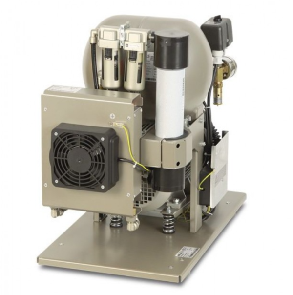 являются источником чистого, безмасляного сжатого воздуха, предназначенного для приведения в движение зубоврачебных приборов и устройств. Благодаря своим параметрам и размерам резервуара воздуха объемом 25 л, компрессор этого типа может обслуживать один комплекс стоматологического устройства или оборудования в зубопротезных лабораториях. Сжатый воздух, производимый безмасляным компрессором указанного типа, обеспечивает высокую степень соблюдения гигиены и качества труда стоматолога, не создавая, притом, вокруг себя среду, содержащую чужеродные вещества.