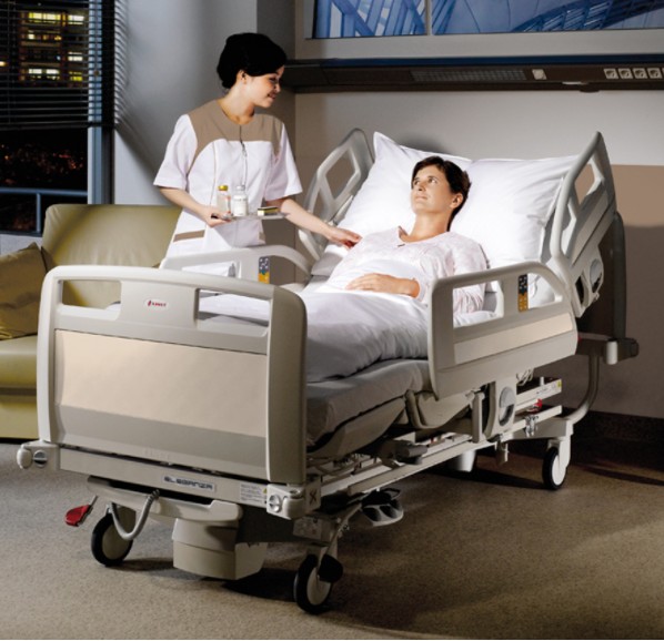 Кровать с разблокированными колесами может стать причиной падений. Система интелектуального тормоза i-brake автоматически определяет окончание транспортировки или перемещения и активирует тормозную систему блокировки колес, если кровать подключена к сети электропитания.