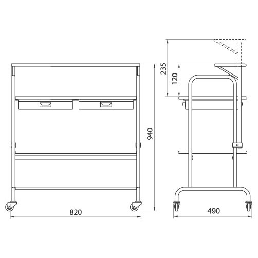 Тележка медицинская из ABS-пластика. Столешница из нержавеющей стали. С боковой выдвигающейся полочкой (дополнительной столешницей) с полкой для дефибриллятора, кардиодоской, держателем кислородного баллона, удлинителем и розеткой.