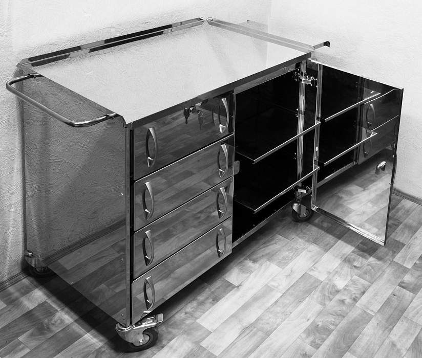 Столик анестезиолога с четырьмя ящиками и дверцей. Снабжен ручкой для транспортировки. Вес 60 кГ. Возможны различные варианты наполнения стола.
