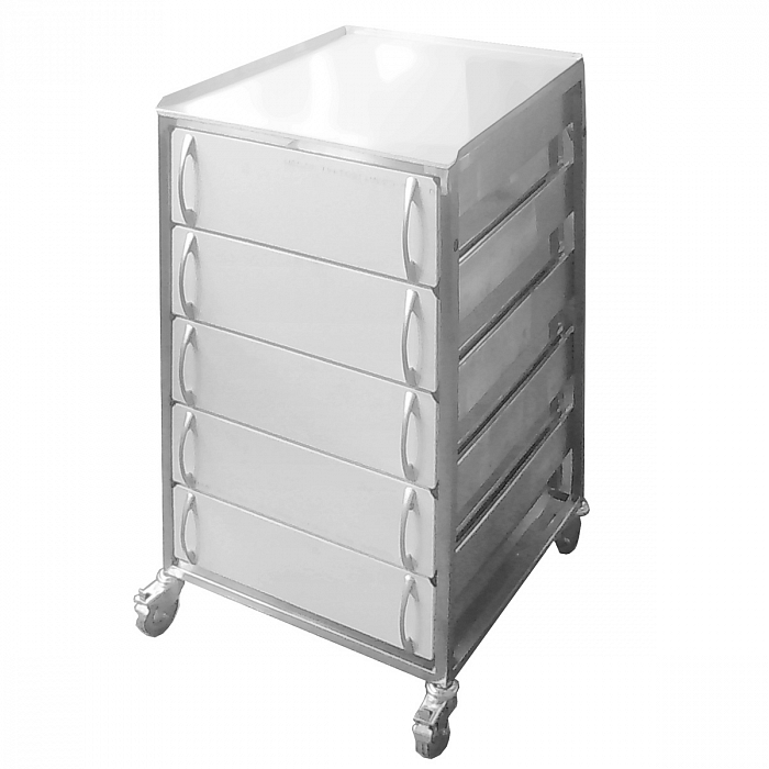 Оснащен с пятью ящиками. Колеса на поворотных кронштейнах обеспечивают легкое перемещение столика
