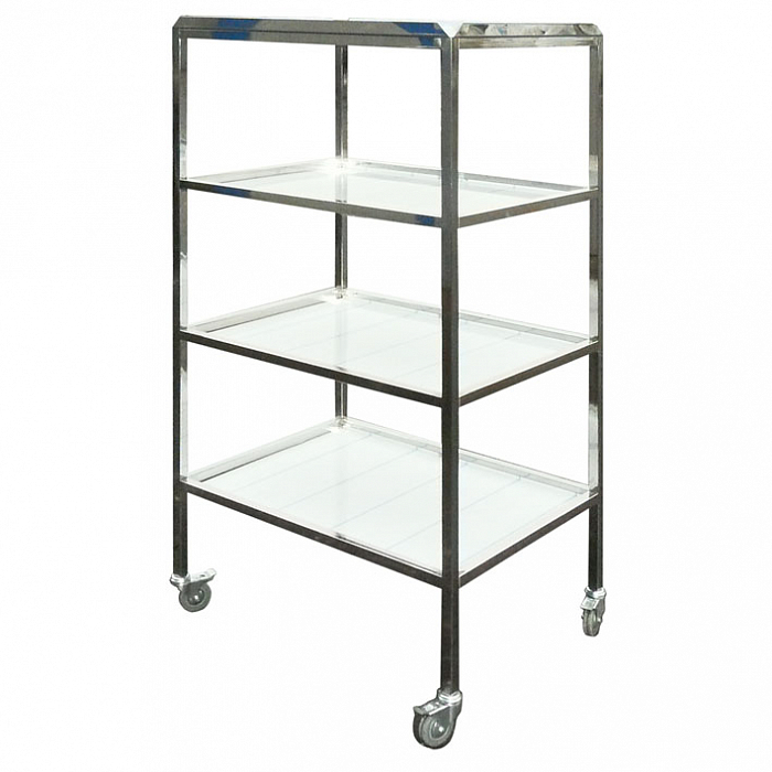 Стеллаж-тележка имеет 4 яруса и предназначена для перевозки стерилизационных коробок. Колеса на поворотных кронштейнах обеспечивают легкое перемещение тележки.