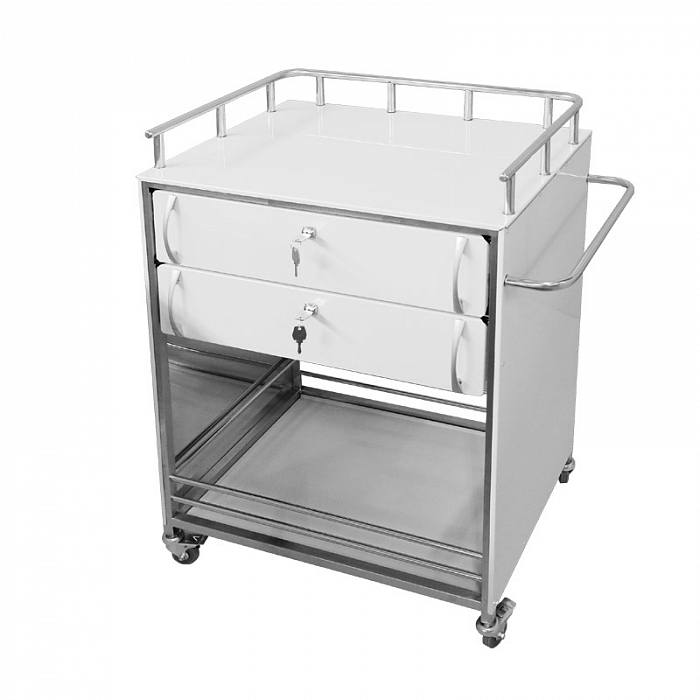 Стол оснащен двумя полками, двумя запираемыми на ключ ящиками, задним и боковыми кожухами. Имеет ручку для удобной транспортировки, а колеса на поворотных кронштейнах обеспечивают легкое перемещение столика