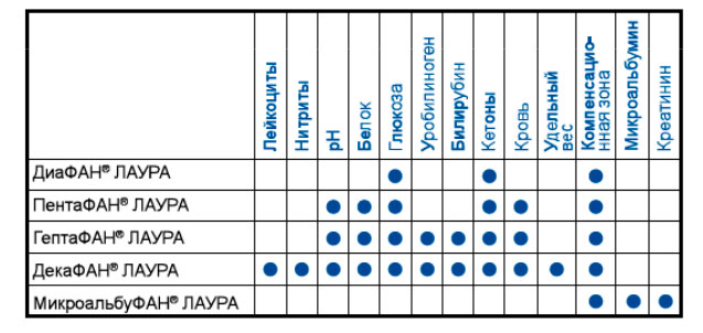 | 10008297 | ДекаФАН LAURA | кровь, кетоны, глюкоза, белок, рН, билирубин, уробилиноген, нитриты, удельный вес, лейкоциты | 100 |